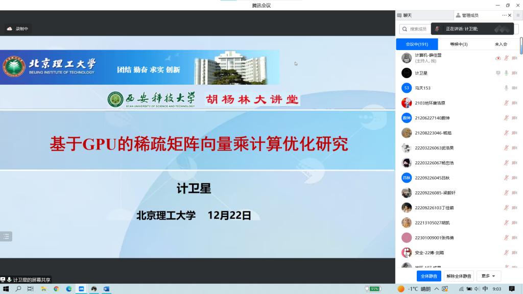 12月22日,雷竞技raybat竞猜承办的“胡杨林大讲堂”以线上腾讯会议的方式进行,学院邀请北京理工大学计卫星教授以“基于GPU的稀疏矩阵向量乘计算优化研究”为主题为学校研究生带来了一场精彩的学术讲座。报告由学院副院长马天教授主持,全校300余名研究生及教师聆听了报告。